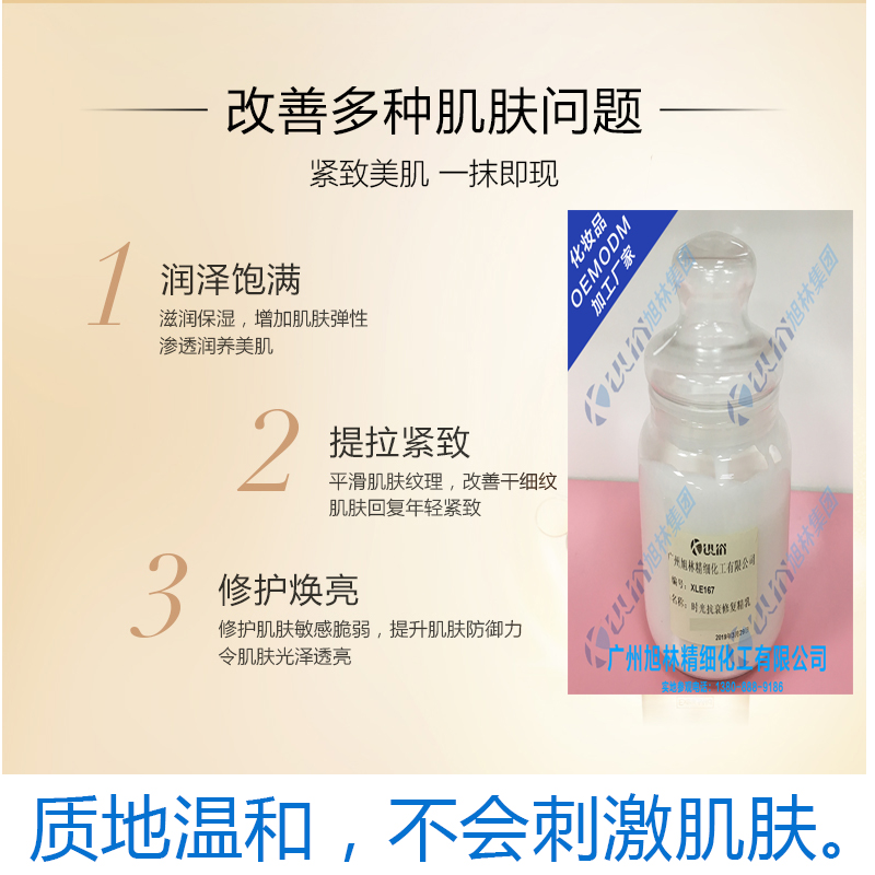 廣州旭林化妝品精細化工有限公司是一家集研發(fā)、生產(chǎn)為一體的專業(yè)化妝品 企業(yè),擁有超過 1 萬平方米達到 GMP 標準的現(xiàn)代化廠房,在行業(yè)內(nèi)頗具 口碑,以研究開發(fā)、專業(yè)從事高端功效型護膚產(chǎn)品、長期研究開發(fā)高端功效 化妝品以及外用保健品的; 產(chǎn)品項目覆蓋面部、身體、抗衰、私密、健康醫(yī) 療等科 技化領(lǐng)域。堅持創(chuàng)新超越、務(wù)實經(jīng)營、精益求精的發(fā)展理念,提供 產(chǎn)品(品牌) 配方定制、產(chǎn)品開發(fā)、生產(chǎn)制造、模式應(yīng)用、售后跟進等精 準服務(wù)。 嚴格按國家各項政策、法規(guī)實施經(jīng)營管理,積極進取,求實創(chuàng)新。嚴 格執(zhí)行質(zhì)量體系的同時按 GMPC 要求組織日常全過程生產(chǎn),使每一支驗 收合格的產(chǎn)品,在市場上讓不同地區(qū)的消費者滿意,從而讓企業(yè)贏得更多 消費者的青睞。